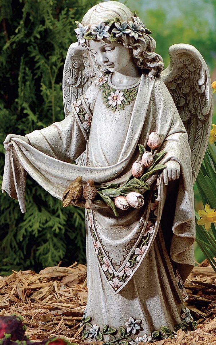 - 花柄のトリミングされたガウンを着た女の子の天使彫像 高さ 約42cm 装飾アートガーデン彫刻(輸入品