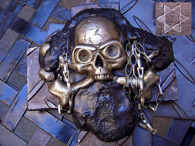 - 卍70S 80S Vintage Made in USA 骸骨 髑髏 魔力 鉄板加工×錫×鎖 無骨 クロス 十字架 インダストリアル ピューター バックル加工 縞鋼 嬲