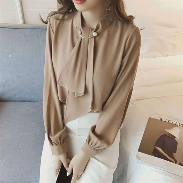- 【L・ペールブラウン】 ボタンランタン スリーブ プルオーバー シフォンブラウス
