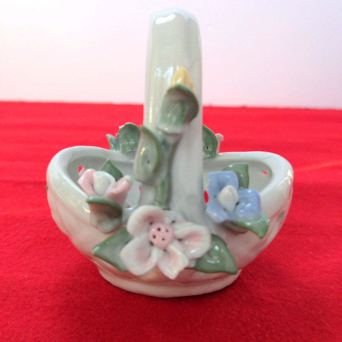 - お花のバスケット 白磁 陶器 フラワーモチーフ サイズ約cm 幅8 奥行6 高さ9.5 とても可愛らしい 小さいお花 すみれ色 ピンク