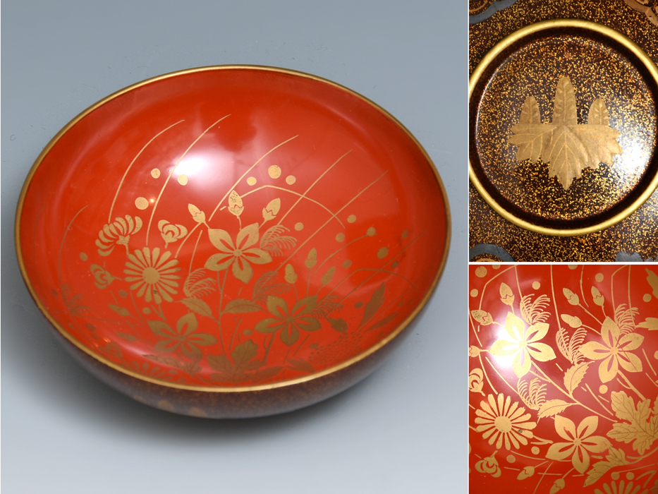 - 名古屋萬茂商店製 秋草蒔絵 酒盃 外側は梨地に織田家家紋 桐と木瓜 大正2年 木盃 木工芸 漆工芸 漆芸 美品 y2084