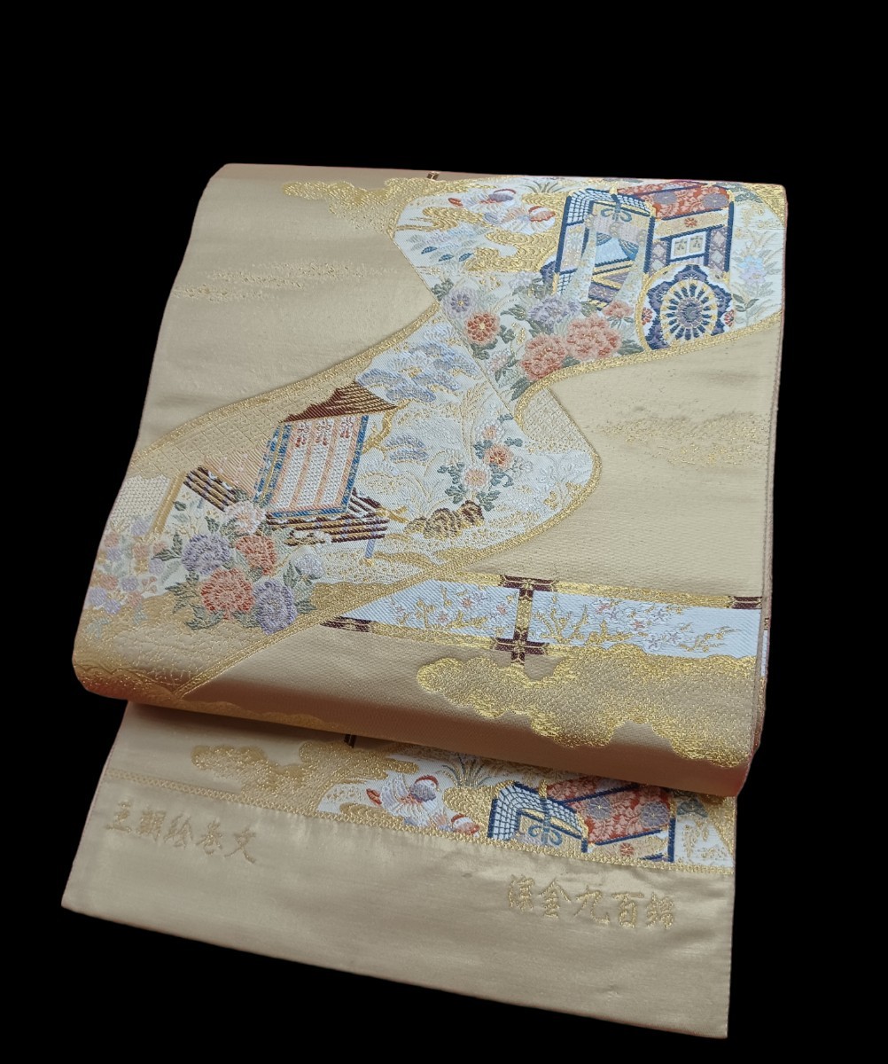 > 岩-帯128)帯 袋帯 漆金九百錦 王朝絵巻文 御所車 雲海 花々 ゴールド 成人式 卒業式 式典 和装 小物 着物 華やか 230307