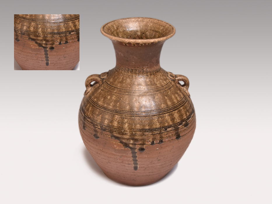 > 漢時代 自然釉線刻長頸双耳壺 灰釉鐘 古代美術 中国美術 唐物 古玩 緑釉 花瓶 花器 花入 花生 鑑賞陶器 後藤美術館同手品 y1638