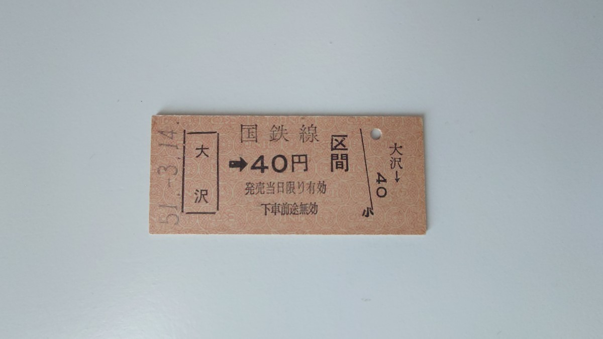 - ▲国鉄▲大沢→40円区間乗車券▲B型硬券昭和51年