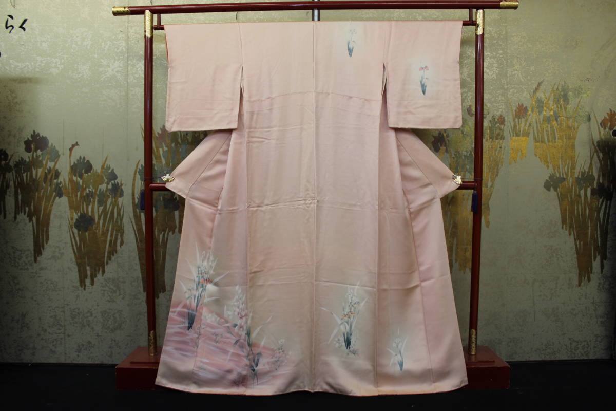 - きもの今昔4895 附下訪問着 広衿袷手縫仕立て 正絹梨地綸子 肌色地に水辺の菖蒲の花が手描された 身丈164cm