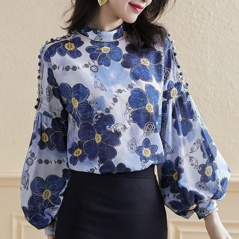 - 【ブルー★M】花柄 ブラウス シャツ ボリューム袖 韓国 大人気