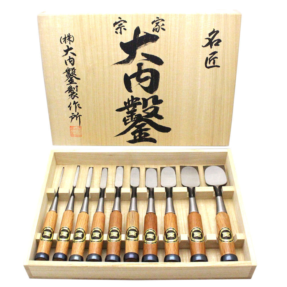 - 播州三木 大内鑿 赤樫柄 追入鑿 本刃付 10本組 桐箱入 鑿 セット