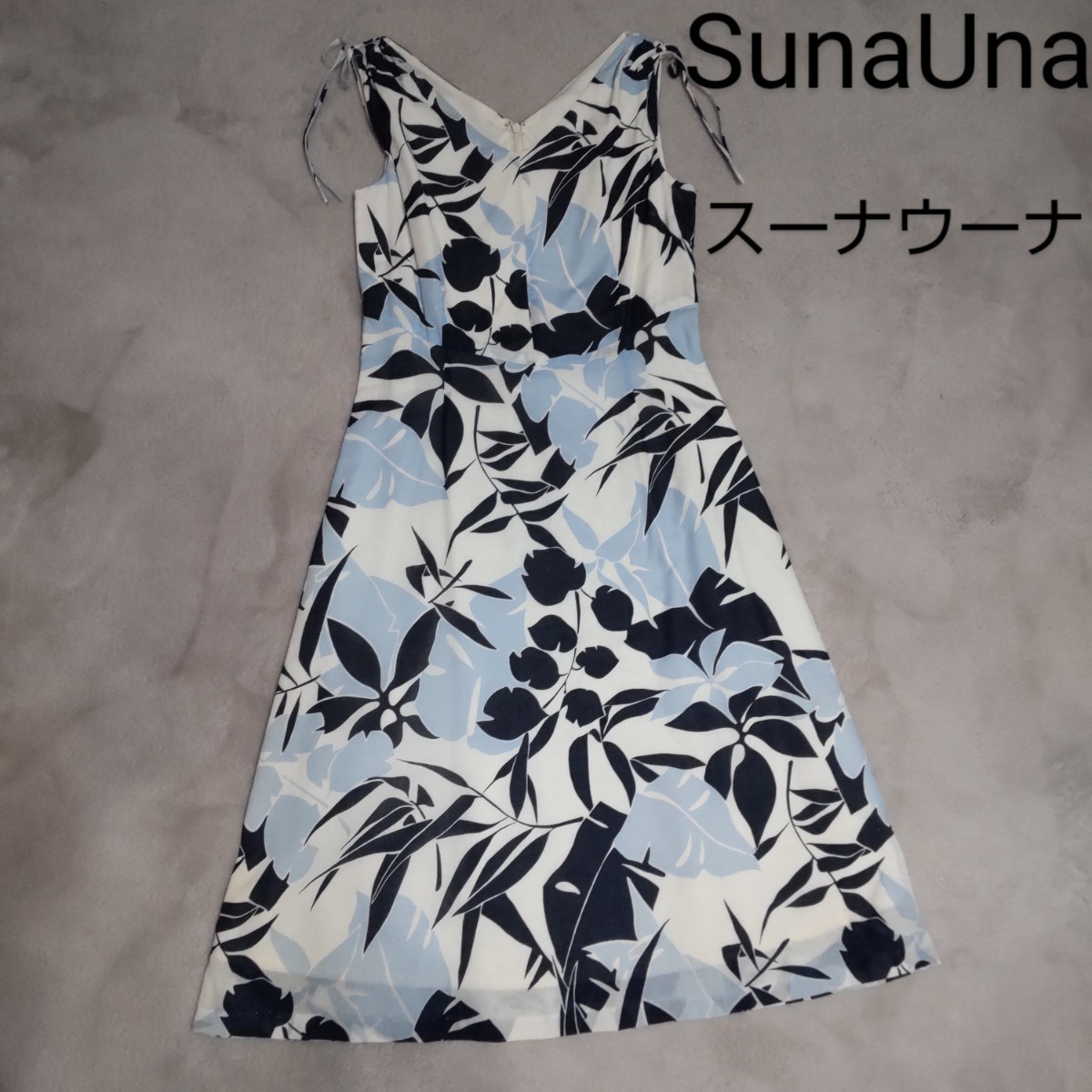 > SunaUna スーナウーナ ノースリーブ ワンピース 花柄 ボタニカル Aライン フレアー ワンピ 白 ブルー 青 ネイビー 紺 膝丈 M リゾート