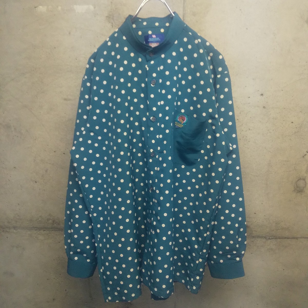 > ヴィンテージ 古着 水玉 ポリシャツ 美品 L 刺繍 ロゴ スタンドカラー レトロ 長袖シャツ ドレスシャツ ドット vintage ビンテージ used