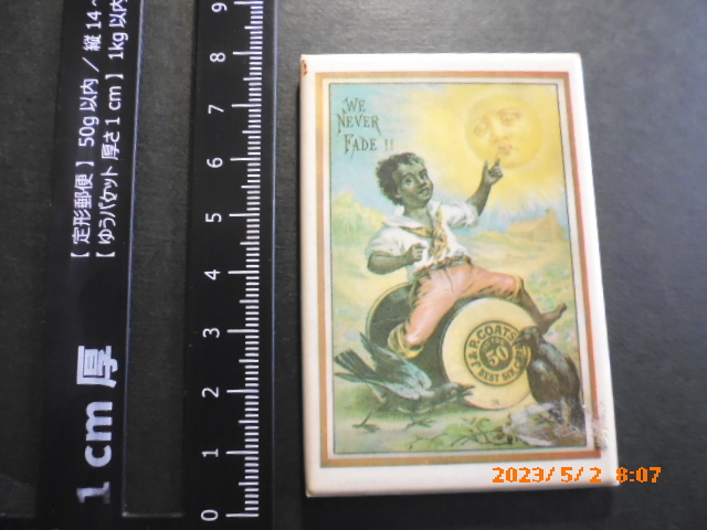 5.5㎝x7.5cm大。 鏡を紙状の物で包んでビニールコ-テイングして有ります。 1970年代の入手ですが、絵柄がユニークです。絵柄は英国で200年以上前から存在する織糸製造会社 J&P..Coats社のもの。 黒い糸の巻いてある糸車に跨った黒い少年、黒いカラス、そして右上には太陽。 「太陽の強い日差しでも弊社の黒糸の色は絶対褪せない。」との意味。 現代では「差別」だと許可されないでしょう。 In 1755 James and Patrick Clark began a loom equipment and silk thread business in Paisely, Scotland. In 1806 Patrick Clark invented a way of twisting cotton together to substitute for silk.