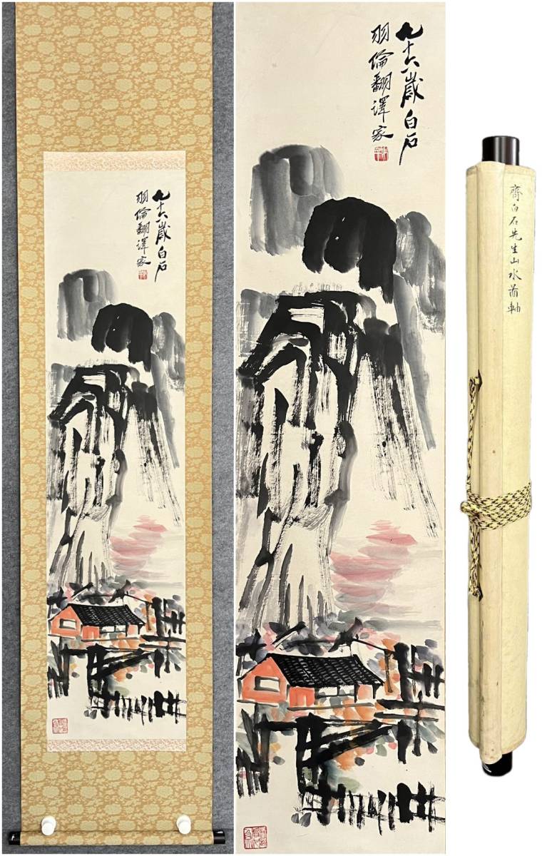 - 古美術 掛軸 中国・近現代 斉白石書 「山水図」 紙本 立軸 書道 巻き物 真筆逸品 肉筆保証 唐物 古画 LT-0584