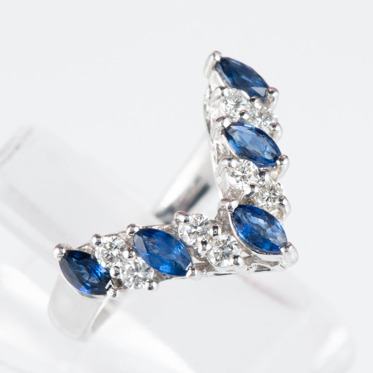マーキースカットのサファイアとラウンドカットのダイヤモンドを使用したV字リング