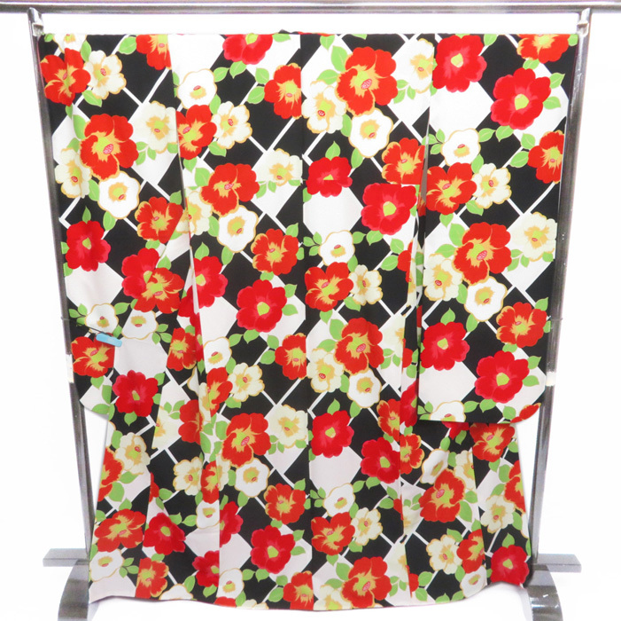 - ★きもの北條★ キスミス 振袖 ポリエステル 花模様 椿 成人式 結婚式 結納 パーティー トール A682-13 L【中古】