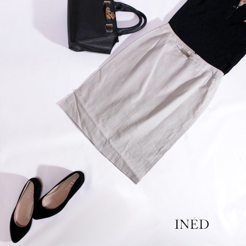 > 美品 イネド INED 株) フランドル ■ シンプル 春 夏 ハリ 定番 コットン シルク 膝下丈 タイトスカート 2 9号 ライトグレー ビジネス