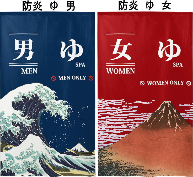 - 和風防炎のれん85×150cm「防炎ゆ(日本語&英語)」【日本製】cos 柄は女「凱風快晴」でお届けします。