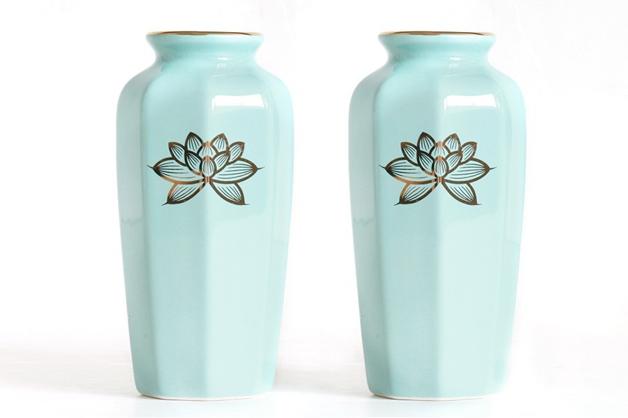 - 国産 磁器 花瓶 ■ 八角 青磁 ■ 上金蓮 5寸 2本組 高さ15cm ■ 仏壇 お盆 お彼岸 お墓参り 供養