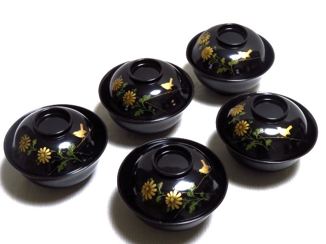 - 吸物椀まとめて5客 漆器 煮物椀 蓋付椀 花鳥 蒔絵