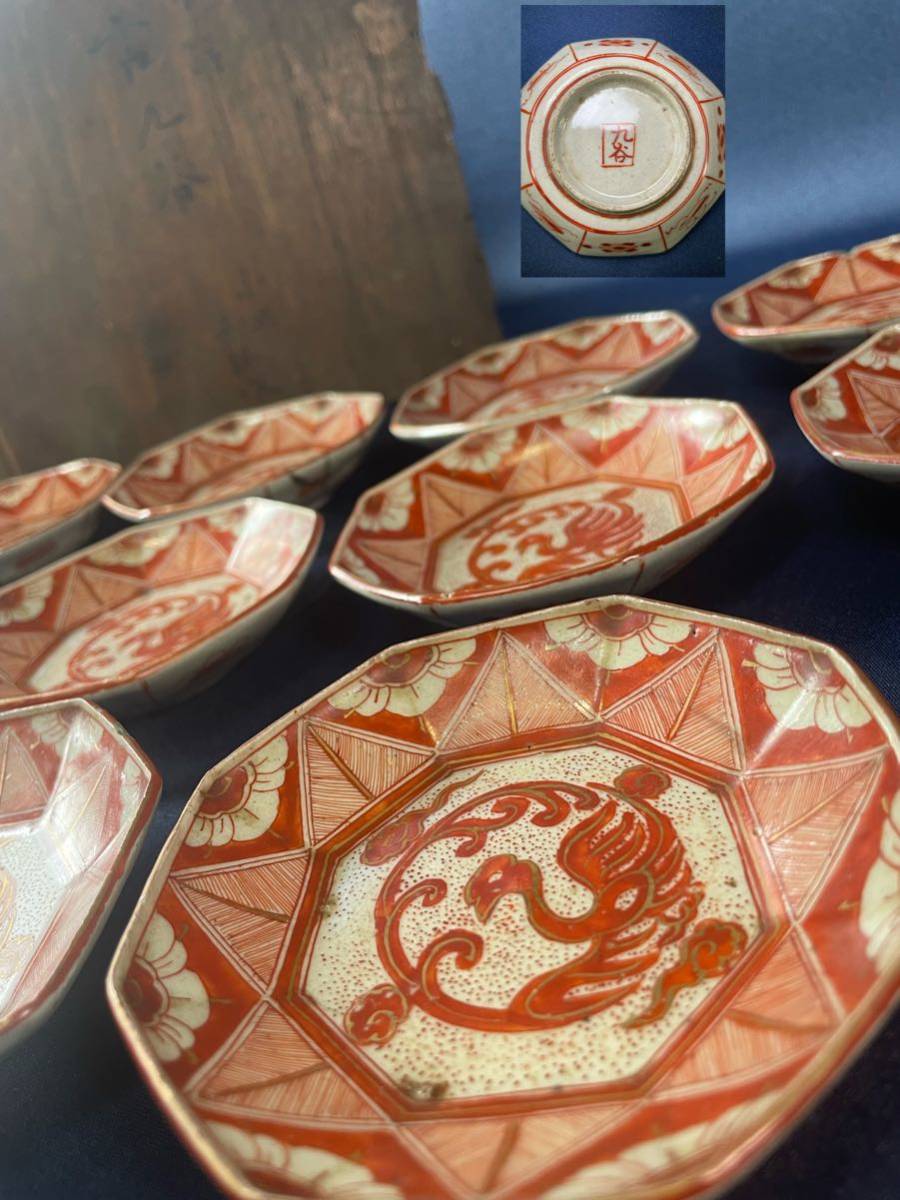 > m6 九谷焼 赤絵 銘々皿 10客 小皿 古九谷 細書 飯田屋 宮本屋 小野 釜 八郎手 蔵出 古美術 骨董 時代物
