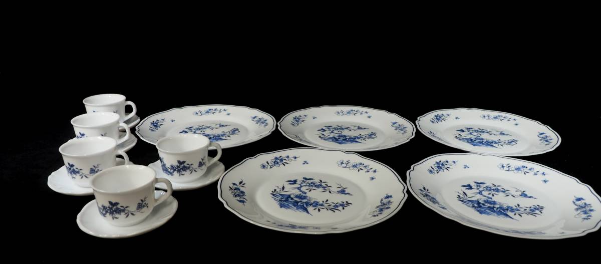 - 昭和期 フランス Arcopal ブルー 花柄ミルクガラス洋食器セット ディナープレート&デミタスカップ5客 Rosian glass 70年代 NYK507
