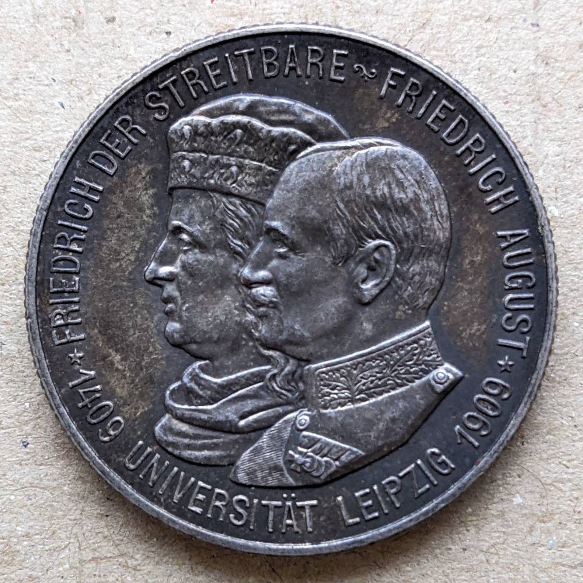 - 1909年 ドイツ ザクセン フリードリヒ・アウグスト3世 ライプツィヒ大学創立500周年記念 2マルク 銀貨 EF ムルデンヒュッテンミント