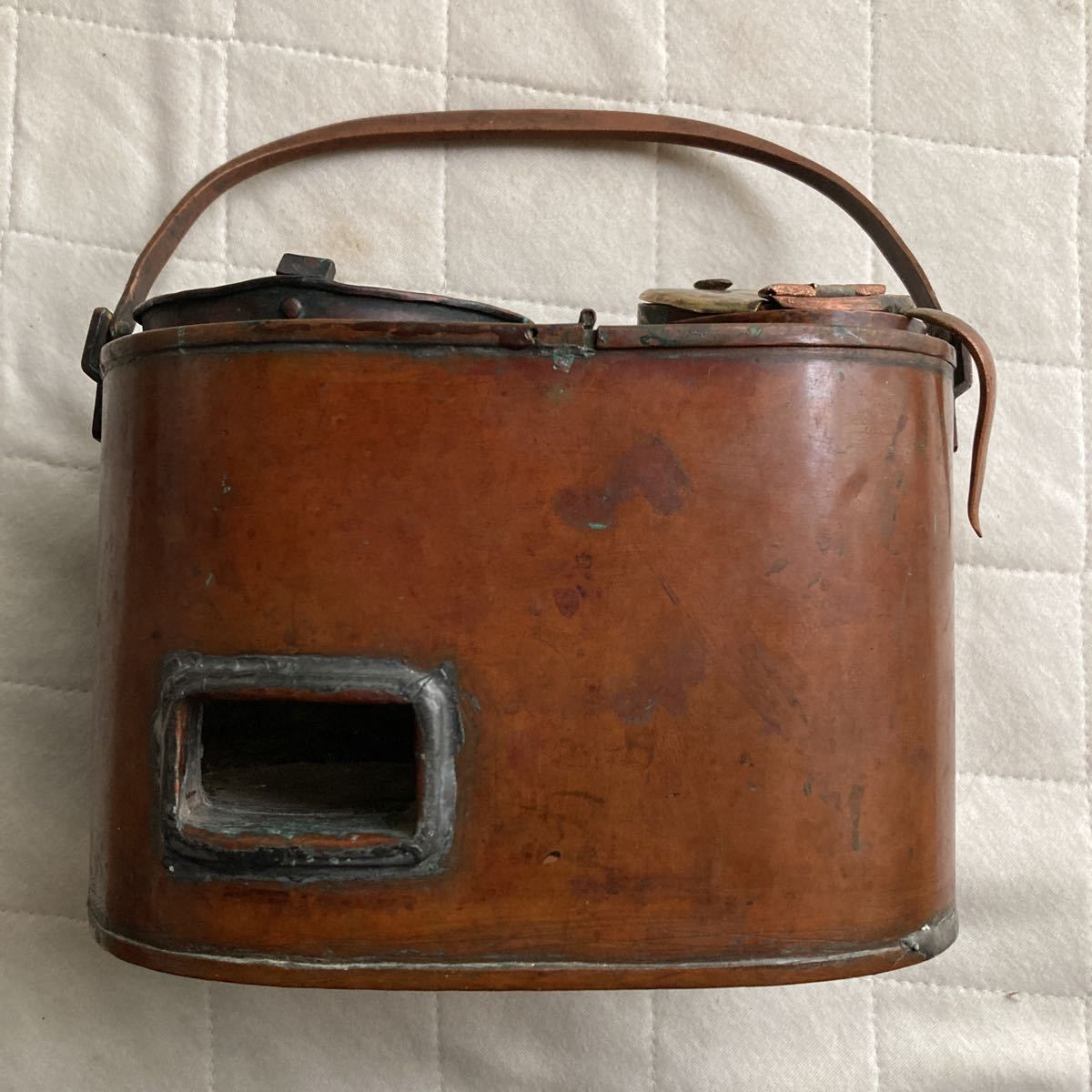 - 明治.大正.昭和初期.レトロな古い酒沸かし器.チロリ.全て銅製.本体の横幅.約17.6cm.縦.約12.3cm.奥行き.約9.9cm.全体.重さ約500gです.