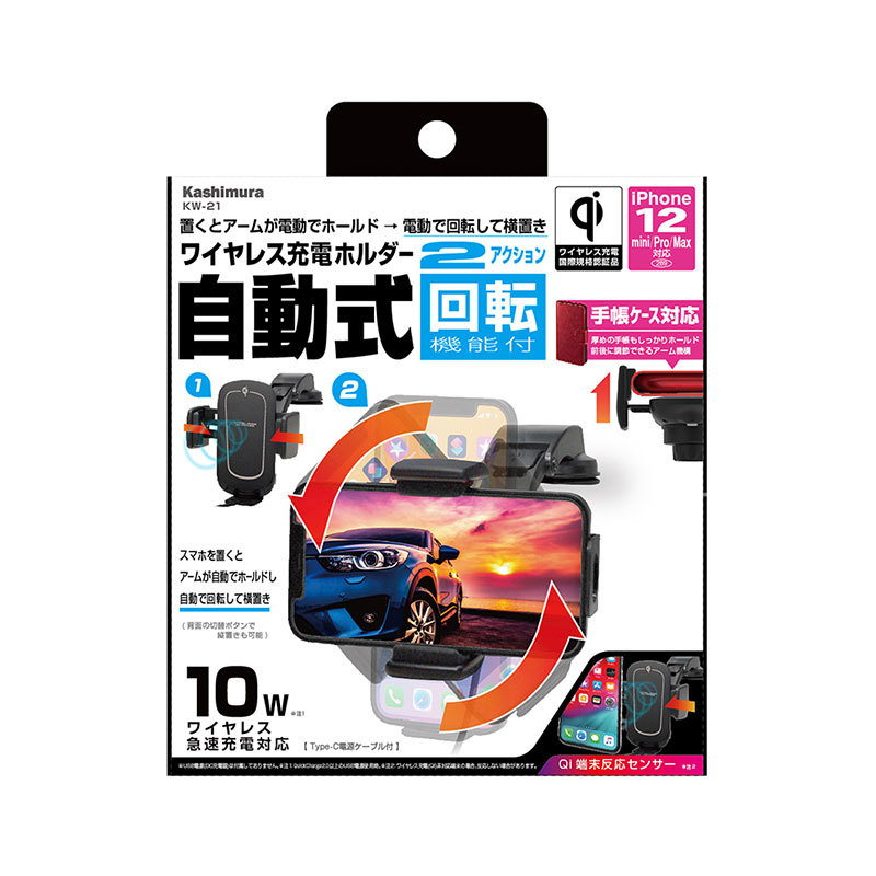 - Qi自動開閉ホルダー 回転機能付 手帳対応 吸盤取付 充電器 ワイヤレス充電 置くだけ 車内 キャパシタ付 カシムラ KW-21