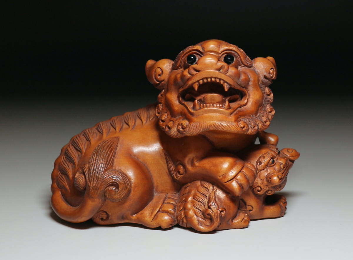 - 【心】k251 置物 獅子の親子 (検索用:彫刻/木彫り/柘植/インテリア)