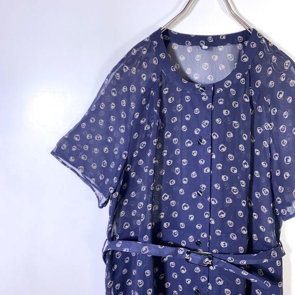 - 昭和 レトロ 長袖 ワンピース ロング 13号 ネイビー系 総柄 フレア エレガント 透け感 ベルト付き 匿名配送