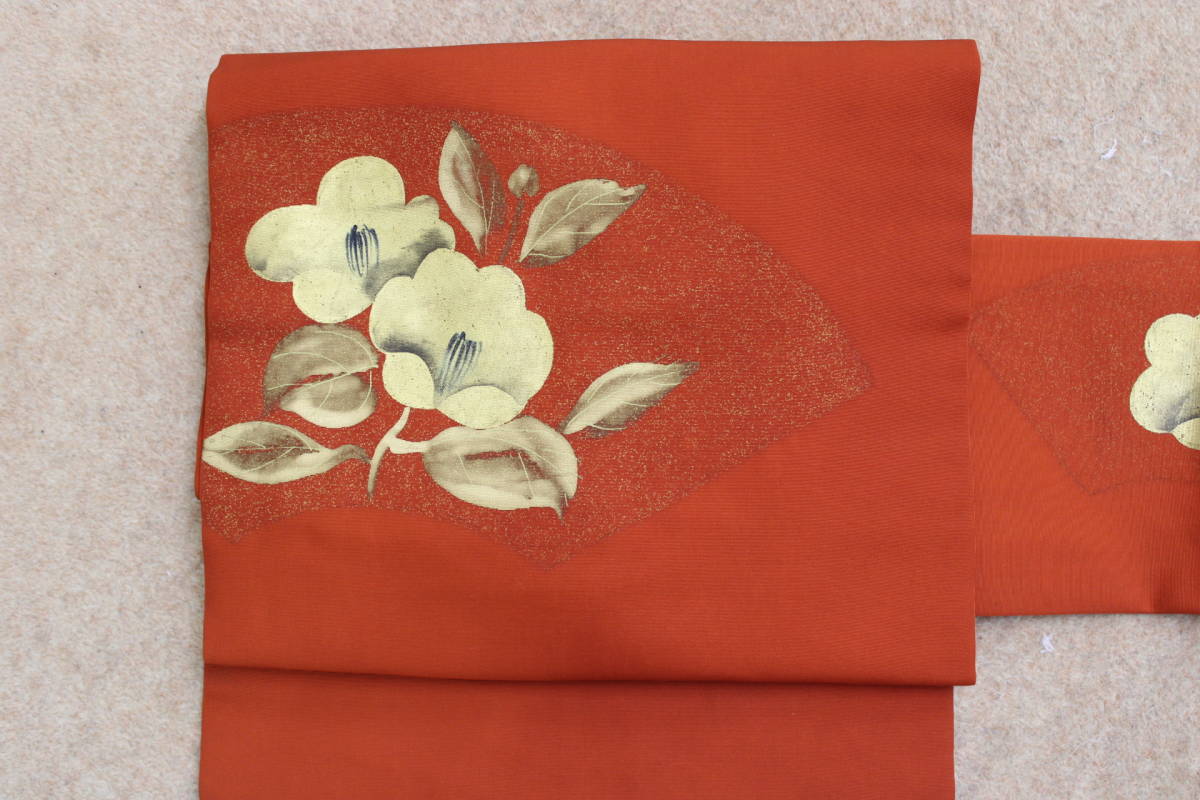 > きもの今昔5562 名古屋帯 正絹塩瀬羽二重染名古屋帯 煉瓦赤色地 金摺り加工で椿の花 特に問題なし 帯の長さ345cm