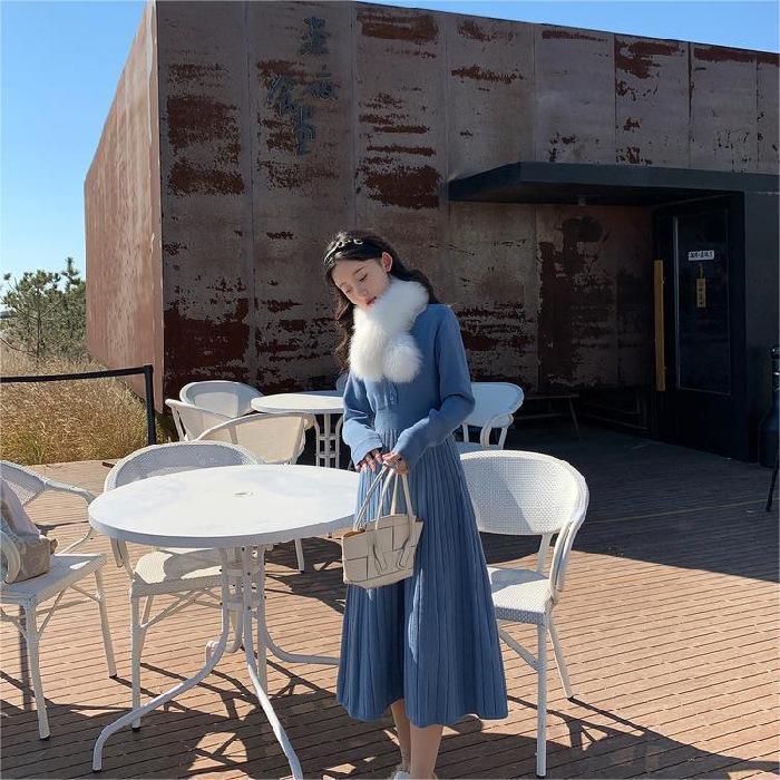 - ★ブルー色★Lサイズ★秋冬 新作 エレガント 長袖 ニット ロングワンピース