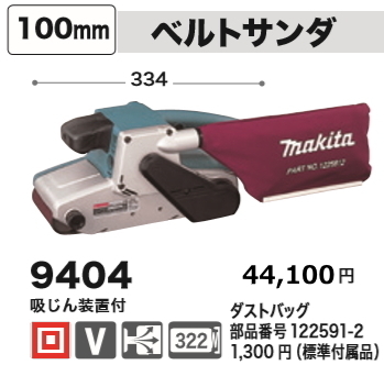 マキタ 100mmベルトサンダ 9404 定価44,100円(税別) ■吸塵装置付 ■コンパクトながらワイドな100mmタイプ ■主要機能 ベルト寸法:100x610mm ベルト速度3.5~7.3(m/s) 210~440(m/分) 電源:単相100v 電流:11A 消費電力:1050w 質量:4.7kg コード5m ■付属品 サンディングベルトWA80 ・ダストバック