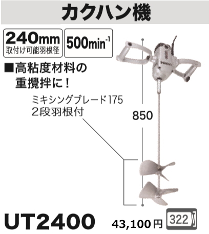マキタ カクハン機 UT2400 定価43,100円(税別) ■高粘度材料の重攪拌に! ■取付可能羽径240mm、回転数500 ■付属品 ミキシングブレード175x2、スパナ13、19