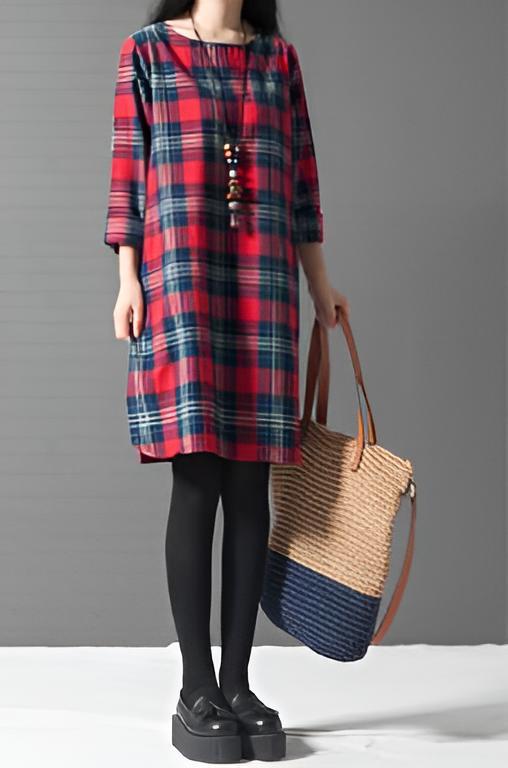 - 15-12.定番ワンピース 長袖 チェック 裏起毛 ひざ 丈 ゆったり レッド XXL