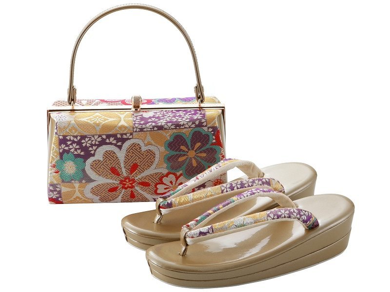 - ◆振袖用◆草履バッグセット 帯地 フリーサイズ 二枚芯 ゴールド bs-340-d【成人式 卒業式 結婚式】