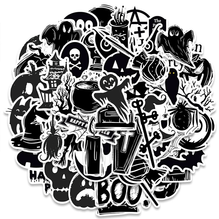- 50枚 ステッカー モノクロ イラスト ハロウィン 防水 耐水 シール 詰め合わせ 1167