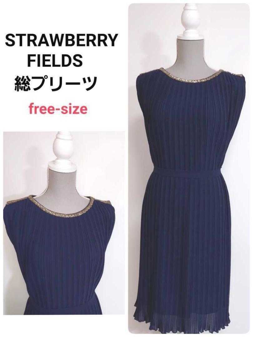 - STRAWBERRY FIELDS 総プリーツ・ビーズ飾りワンピース ネイビー サイズ表記なしパーティドレス 結婚式 二次会 発表会 80160