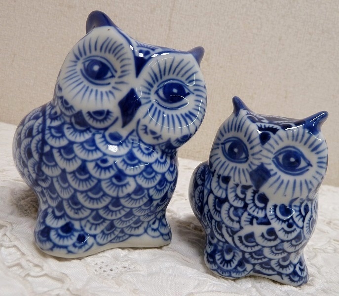 > (☆BM)染付 陶器製 ふくろう 置物 オブジェ 2点 みみずく 梟 鳥 縁起物 親子フクロウ 夫婦梟 九谷/有田焼