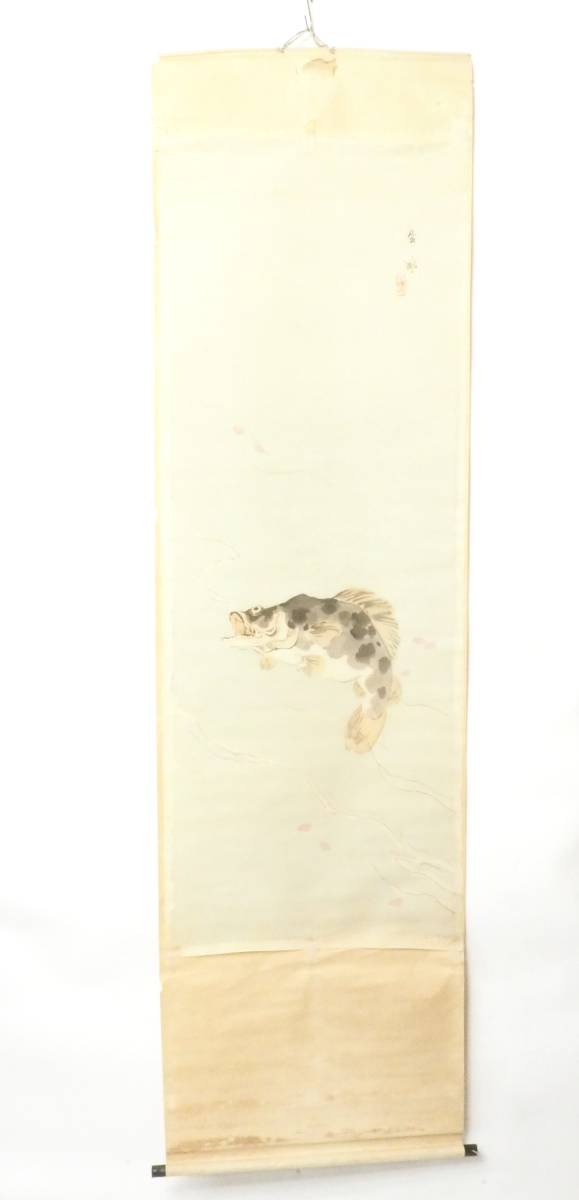 - 大正昭和期ビンテージ 日本画家 西沢笛畝 魚図 絹本掛軸 在銘品 在銘「笛畝」 落款「木槿庵」 日本画 水彩画 箱無し OTK510