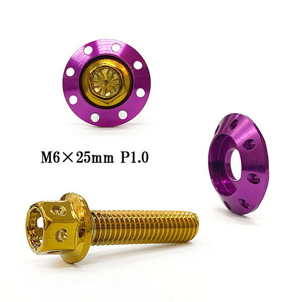 > M6 25mmフランジボルト P1.0 座面枠 20×4mm アルミ カラーワッシャー デザイン フジツボ 車 バイク ドレスアップ ゴールド×パープル