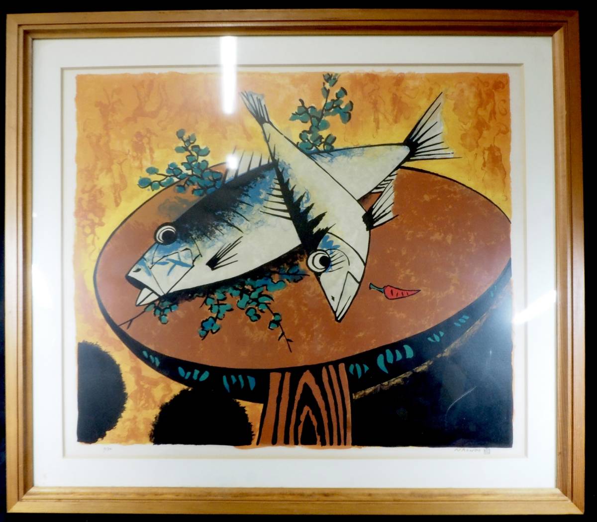 > 目を惹く色使いが特徴的!昭和期ビンテージ 真作 中村 直人作「静止画 魚」リトグラフ 5/50 鉛筆書きの直筆サイン有 TNI510