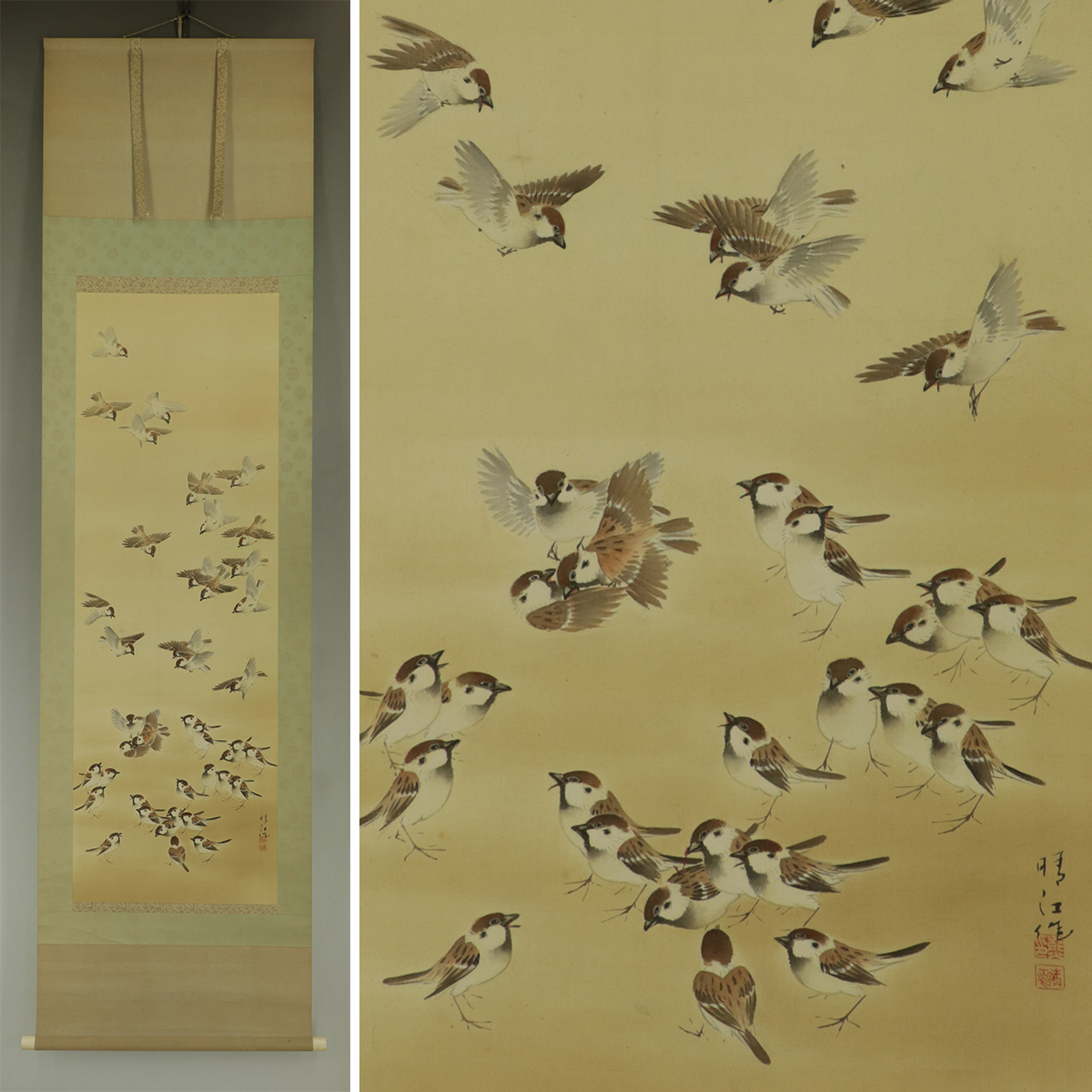 - 【真作】中島晴江【群雀図】◆絹本◆掛軸 t04021