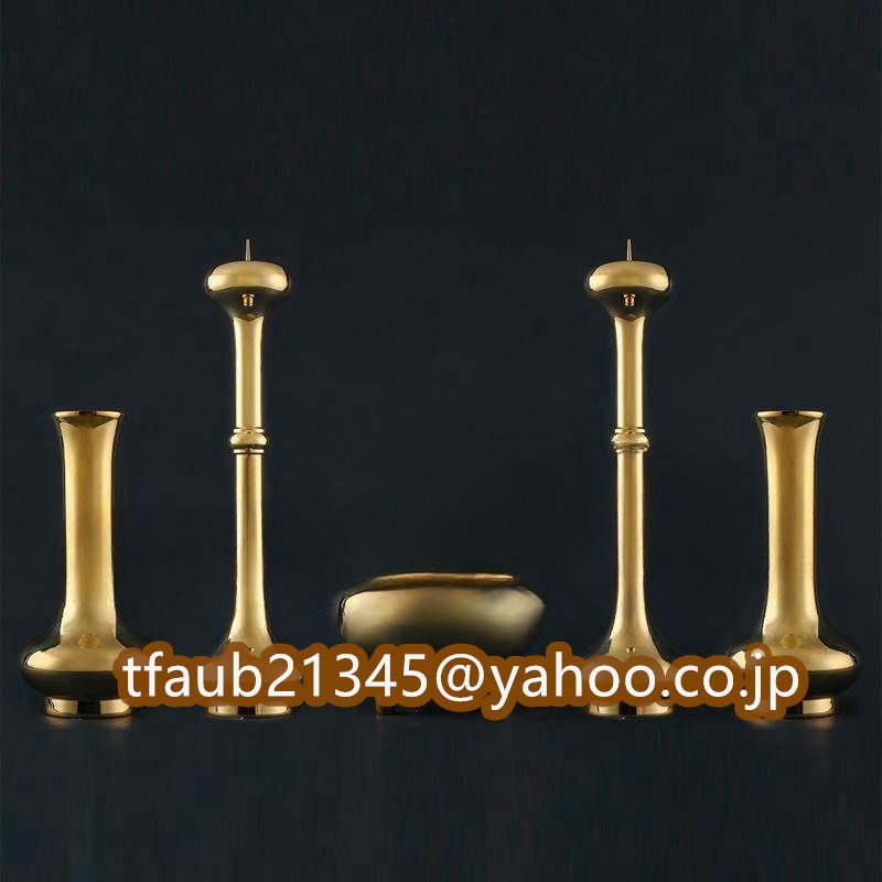 - 「密教法具 寺院仏具」大型 寛通型 五具足 花立1対 火立1対 香炉1個 仏教工芸品 磨き仕上げ 真鍮製 9寸