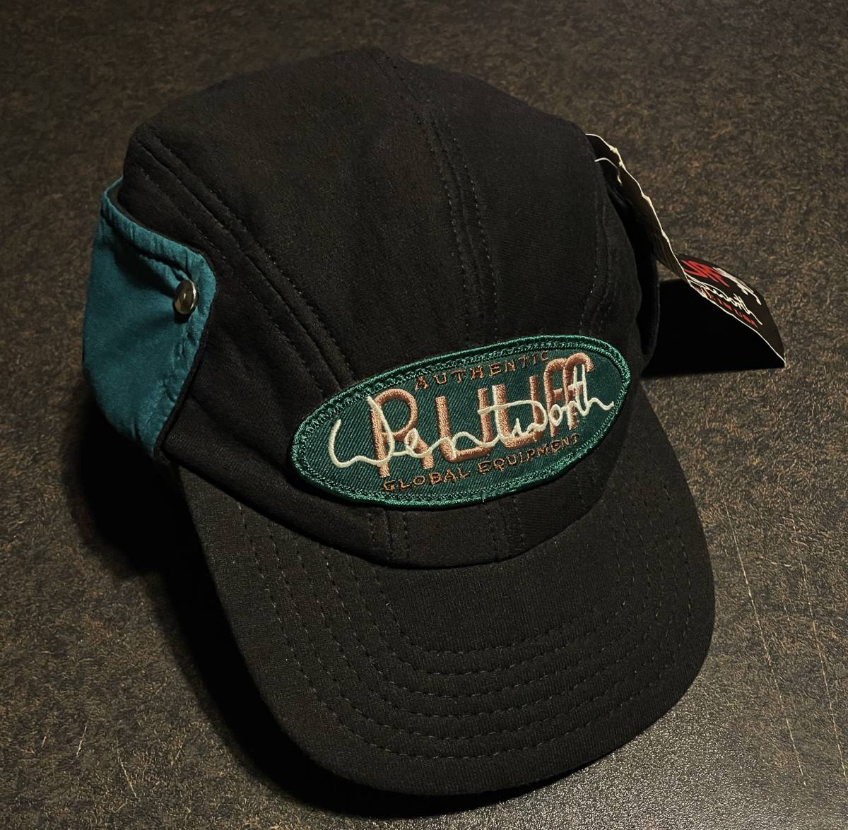 - USA製デッドストック90sビンテージ2wayキャップL~スエット地パネル黒/緑ワッペン耳当て付き米製US製90年代ビンテージ(ジェット企業フライト