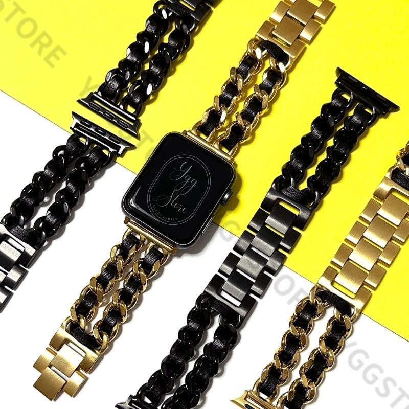 - 【コマ調節工具不要】アップルウォッチ ステンレス バンド C チェーン ベルト 本革 レザー apple watch 42 44 45 49 黒 金 ブラック