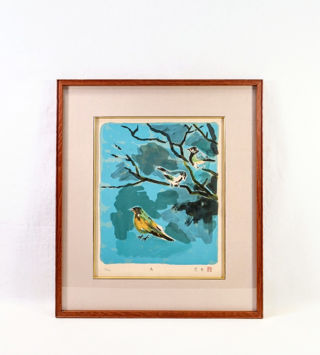 > 真作 三輪晁勢 リトグラフ「鳥」画寸 33cm×39cm 新潟県出身 日本芸術院会員 堂本印象に師事 鋭い観察力と独自の色彩感覚の花鳥図 8192