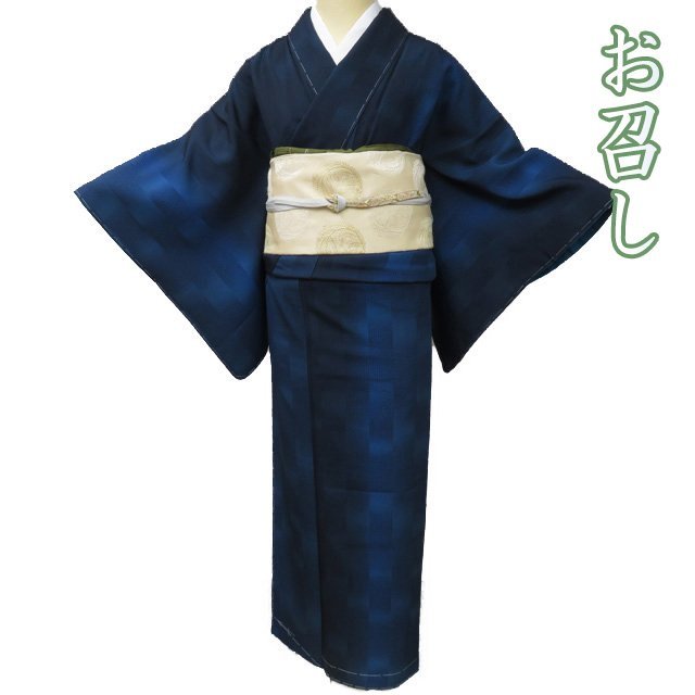 - 特選 お召し 御召 着物 中古 正絹 袷 カジュアル 花模様 藍色 濃紺色 身丈152cm 裄63.5cm SA きもの北條 A953-1