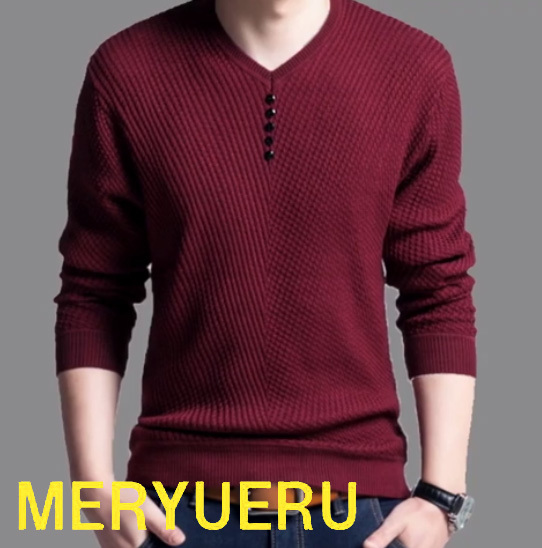 > *[3a09] 【MERYUERU】メリュエル vネックセーター 長袖 薄手 Sサイズ ボルドー色 フェイクボタン、メンズ ゴルフウエアー、薄手 ★新品