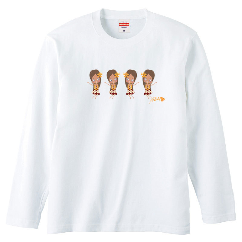 > レディースM対応(タグ表記男女兼用S)/ホワイト*4人フラガール&モンステラプリント*長袖/Tシャツ/フラダンス/ハワイ/送料無料【tl018】