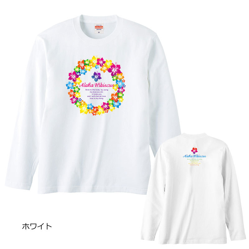 > レディースM対応(タグ表記男女兼用S)/ホワイト*カラフルハイビスカスサークル&ロゴ*長袖/Tシャツ/フラダンス/ハワイ/送料無料【tl070】