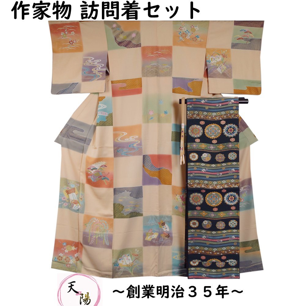 > 着物セット 作家物 訪問着・未使用品 袋帯・帯締め 3点 セット Lサイズ 市松取色紙模様 落款有り 中古 リサイクル着物 正絹 きもの天陽